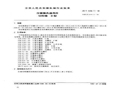本标准规定了冷镦GB5780~5786六角头螺栓M3~M12、GB70内六角圆柱头螺钉M4~M12及GB65~69、GB818~820螺钉M3~M10B型切料模的结构型式与尺寸、技术要求和标记。本标准适用于双击整模自动冷镦机和多工位自动冷机的模具。2引用标准