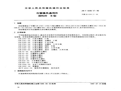 本标准规定了冷镦GB5780~~5786六角头螺栓M3-M16、GB70内六角圆柱头螺钉M4~M16及GB65~69、GB818~820螺钉M2~M12B型顶料杆的结构型式与尺寸、技术要求和标记。本标准适用于双击整模自动冷镦机的模具。2引用标准