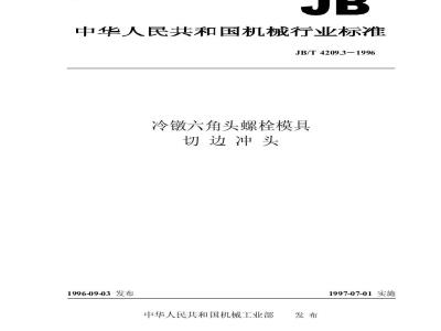 本标准系参考国内外几十种冷镦模具图纸,以我国目前广泛成熟应用的紧固件冷镦工艺和冷镦模具结构型式为依据,并充分考虑了今后新工艺、新模具的发展而制订的、本标准从1997年7月1日起实施,同时代替JB4209.3一86本标准由全国模具标准化技术委员会提出。本标准由机械工业部北京机电研究所归口。本标准起草单位:沈阳标准件研究所。本标准主要起草人:李坚。