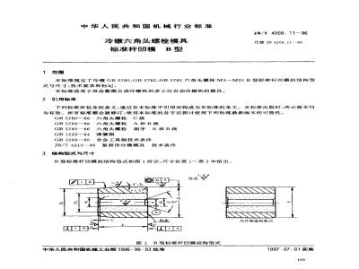本标准规定了冷镦GB 5780、GB 5782、GB 5785六角螺栓M3~M20B型标准杆凹模的结构型式与尺寸、技术要求和标记。 本标准适用于双击整模自动冷镦机和多工位自动冷镦机的模具。 JB/T 4209.11-1996 冷镦六角头螺栓模具 标准杆凹模 B型 JB/T4209.11-1996 标准下载解压密码:www.bzxz.net