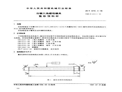 本标准规定了冷镦GB 6170~6171、GB 6175~6176六角螺母M8~M20整形冲头的结构型式与尺寸、技术要求和标记。 本标准适用于螺母自动冷镦机的模具。 JB/T 4210.3-1996 冷镦六角螺母模具 整形顶料杆 JB/T4210.3-1996 标准下载解压密码:www.bzxz.net