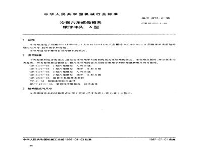 本标准规定了冷镦GB6170~~6171、GB6175~6176六角螺母M1.6~M20A型镦球冲头的结构型式与尺寸、技术要求和标记。本标准适用于螺母自动冷机的模具。2引用标准