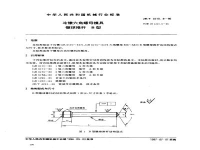 本标准规定了冷镦GB 6170~6171、GB 6175~6176六角螺母M8~M20B型镦球推杆的结构型式与尺寸、技术要求和标记。 本标准适用于螺母自动冷镦机的模具。 JB/T 4210.9-1996 冷镦六角螺母模具 镦球推杆 B型 JB/T4210.9-1996 标准下载解压密码:www.bzxz.net