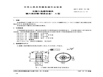 本标准规定了冷镦GB6170~6171.GB6175~6176六角螺母M1.6~~M4A型镦六角凹模的结构型式与尺寸、技术要求和标记。本标准适用于螺母自动冷镦机的模具。2引用标准