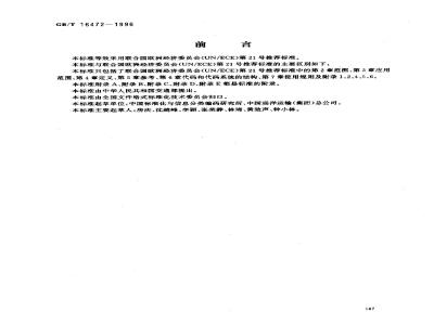 本标准等效采用联合国欧洲经济委员会(UN/ECE)第21号推荐标准。本标准与联合国欧洲经济委员会(UN/ECE)第21号推荐标准的主要区别如下:本标准只包括了联合国欧洲经济委员会(UN/ECE)第21号推荐标准中的第2章范围、第3章应用范围、第4章定义、第5章参考、第6章代码和代码系统的结构、第7章使用规则及附录1、2、4、5、6。本标准附录 A、附录 B、附录 C、附录 D、附录 E 都是标准的附录。本标准由中华人民共和国交通部提出。本标准由全国文件格式标准化技术委员会归口。本标准起草单位:中国标准化与信息分类编码研究所、中国远洋运输(集团)总公司。本标准主要起草人:房庆、沈越峰、李颖、张荣静、林琦、黄致声、钟小林。187