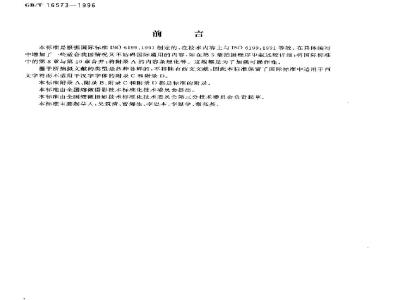 本标准层根据国际标准[S06199:1991制定的,在技术内等上与[S06199:1991等效。在具体编写中增加了·些适合我国情况又不茹得国际通用的内容,如在第5章拍摄程序中叙述较详细:将国际标准中的第8章与第10章合并;将附录A的内容条理化等,这些都层为了加强可操作性。基于所拍摄文献的类型是种各样的,不排除有西文文献,因此本标准保留了国际标雅中适用于西文字符而不适用于汉字字体的附录C和附录D)。本标准附录A、附录B、附录C和附录[都是标准的附求,本标准由全国缩微摄影技术标准化技术委员会提出。本标准由全国缩微摄影技术标准化技术委员会第分技术委员会负责起草,本标准十要起卓人:吴筑清、曾海生、季思本、李恩学,素兆英,GB/T16573—1996