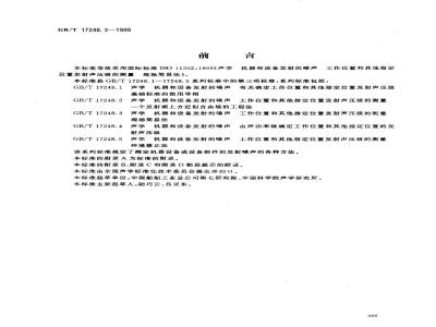 本标准等效采用国际标准ISO11202:1995《声学机器和设备发射的噪声工作位置和其他指定位置发射声压级的测量现场简易法》。本标准是GB/T17248.1~17248.5系列标准中的第三项标准,系列标准包括:GB/T17248.1声学机器和设备发射的噪声有关确定工作位置和其他指定位置发射声压级基础标准的使用导则