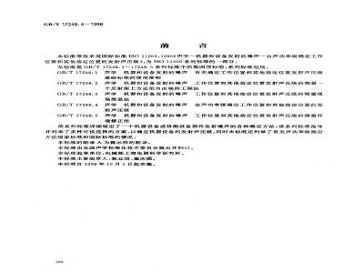 本标准等效采用国际标准ISO11203:1995《声学-机器和设备发射的噪声一由声功率级确定工作位置和其他指定位置的发射声压级》,为ISO11200系列标准的一部分。本标准是GB/T17248.1~17248.5系列标准中的第四项标准,系列标准包括:GB/T17248.1声学机器和设备发射的噪声有关确定工作位置和其他指定位置发射声压级基础标准的使用准则