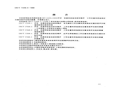 本标准等效采用国际标准ISO11204:1995《声学机器和设备发射的噪声工作位置和其他指定位置发射声压级的测量环境修正法》。本标准是GB/T17248.1~17248.5系列标准中的第五项标准,系列标准包括:GB/T17248.1声学机器和设备发射的噪声有关确定工作位置和其他指定位置发射声压级基础标准的使用导则