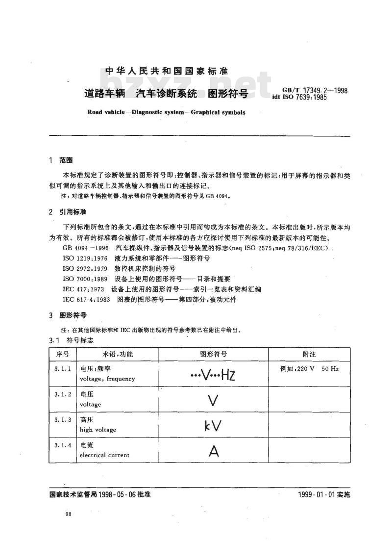 本标准规定了诊断装置的图形符号即:控制器、指示器和信号装置的标记,用于屏幕的指示器和类似可调的指示系统上及其他输入和输出口的连接标记。注:对道路车辆控制器、指示器和信号装置的图形符号见GB4094。2引用标准