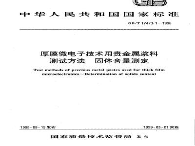 Test methods of precious metal pastes used for thick filmmicroelectronics-Determination of solids content本标准规定了贵金属浆料中固体含量的测试方法。GB/T17473.1-1998