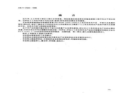 近年来,土工布用于排水工程已非常普遍。例如地基的垂直排水设施或道路工程中的水平排水层等。这样沿土工布的平面方向的水流(渗透)特性指标的测定非常重要。本标准是根据国际标准最终草案ISO/FDIS12958:1998《土工布及其有关产品平面内水流量的测定》制定的,规定了测定在不同的法向压力及标准的水力梯度下土工布及其有关产品的平面内水流量的方法。其技术内容与该国际标准等效。由于对产品的超时施压将对平面内水流量产生实质性影响,所以对土工布及其有关产品的长期水流量,应结合其长时间压缩变性能试验一同评定。评定土工布及其有关产品的压缩螨变性能的方法见FZ/T01051.1-1998《纺织材料和纺织制品压缩性能第1部分:耐久压缩性能的测定》。附录 A 和附录 B是提示的附录。本标准由国家纺织工业局提出。本标准由全国纺织品标准化技术委员会产业用纺织品分技术委员会归口。本标准主要起草单位:中国纺织总会标准化研究所、河南纺织研究院。本标准主要起草人:霍书怀、李伟锋、赵松江。159