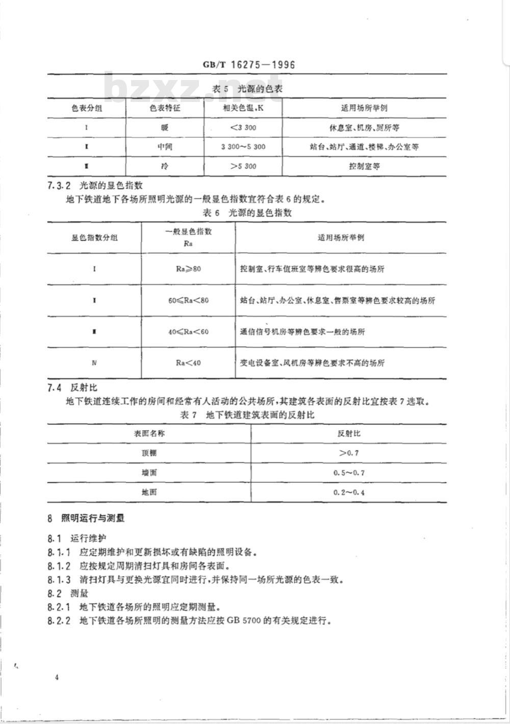 8.2.1地下铁道各场所的照明应定期测量。8.2.2地下铁道各场所照明的测量方法应按GB5700的有关规定进行。4