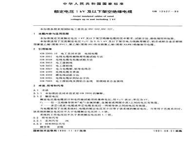 本标准规定交流额定电压1kV及以下架空绝缘电缆的技术要求、检验方法、验收规则和包装。本标准适用于交流额定电压U0/U为0.6/1kV及以下架空电力线路用铜芯、铝芯或铝合金芯耐侯型聚氯乙烯(简称PVC)、聚乙烯(简称PE)和交联聚乙烯(简称XLPE)绝缘架空电缆。 GB 12527-1990 额定电压I kV及以下架空绝缘电缆 GB12527-1990 标准下载解压密码:www.bzxz.net
