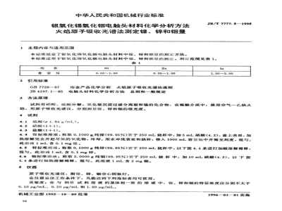 原子吸收光谱仪,附镍、锌、铟空心阴极灯。在仪器最佳工作条件下,凡能达到下列指标者均可使用。灵敏度:在与测量试料溶液的基体相一致的溶液中,镍、锌和的特征浓度应分别不大于0.10μg/mL、0.20μg/mL和1.60μg/mL。机械工业部1995—10--09批准