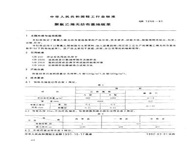 本标准规定了聚氯乙烯无纺布基地板革的产品分类、技术要求、试验方法、检验规则及标志、包装、运输、贮存本标准适用于以聚氯乙烯树脂为主要原料,加人适量助剂,用压延工艺生产的聚氯乙烯无纺布基地板革(以下简称地板革)。该产品主要用于家庭、宾馆、办公室等处的地面装饰。 QB/T 1256-1991 聚氯乙烯无纺布基地板革 QB/T1256-1991 标准下载解压密码:www.bzxz.net