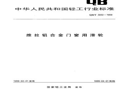 本标准是原国家标准GB/9304一1988《推拉铝合金门窗用滑轮》,经由国轻行E1999】112号文发布转化标准号为QB3892—1999,内容同前。本标准由原中华人民共和国轻工业部中国室内成套用品总公司提出.本标准由全国建筑五金标准化质量检测中心归口。本标准由广东佛山铝合金制品厂、上海市建筑五金工业研究所、上海窗钩厂负贵起草。本标准委托全国建筑五金标准化质量检测中心负责解释。iikAoNiiAca