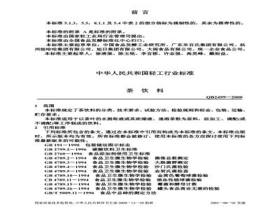 本标准规定了茶饮料的分类、技术要求、试验方法、检验规则和标志、包装、运输、贮存要求。本标准适用于以茶叶的水提取液或其浓缩液、速溶茶粉为原料,经加工、调配(或不调配)等工序制成的饮料。 QB 2499-2000 茶饮料 QB2499-2000 标准下载解压密码:www.bzxz.net
