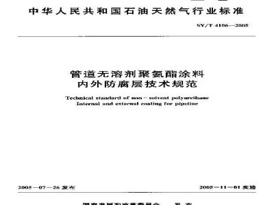 标准规定了管道无溶剂聚氨醋涂料内外防腐层的设计、施工与验收。本标准适用于:a)输送介质为原油及成品油、水、天然气且温度不大于90℃的钢质和铸铁管道无溶剂聚氨醋涂料内防腐层的设计、施工与验收。b)使用温度不大于100℃的埋地和表层涂敷抗紫外线涂层的地上钢质和铸铁管道无溶剂聚氨醋涂料外防腐层的设计、施工与验收。 SY/T 4106-2005 管道无溶剂聚氨酯涂料内外防腐层技术规范 SY/T4106-2005 标准下载解压密码:www.bzxz.net