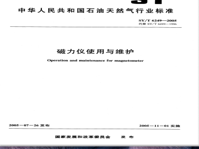 本标准代替SY/T6249--1996《质子磁力仪使用与维护》。本标准与SY/T6249-1996相比,主要变化如下:标准更名为《磁力仪使用与维护》;-对个别条目的标题和内容作了调整、合并和补充,并对相关措辞作了相应变动;一删除了野外测量工作中的梯度测量和仪器检测中的测定方法;-增加了G一858型磁力仪的有关内容,如仪器的具体操作步骤、采集数据的传输步骤及波特率的选择;