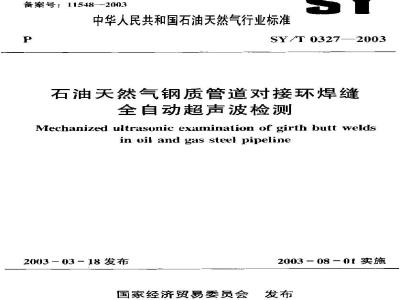 本标准适用于利用多通道、声聚焦、分区扫查的全自动超声波检测系统,对壁厚为7mm~50mm的钢质石油和天然气长输、焦输及其他油气管道对接环焊缝电弧焊的全自动焊、半自动焊焊缝的检测与质量评定。本标准不适用于管径小于150mm的钢质管道环焊缝的检测。 SY/T 0327-2003 石油天然气钢质管道对接环焊缝全自动超声波检测 SY/T0327-2003 标准下载解压密码:www.bzxz.net
