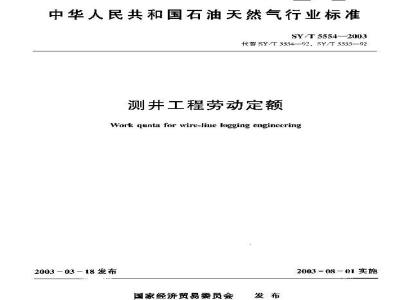 个标准整含解订卡代替5Y5554—2测井T程芳动定额和YT5555—92射,并壁取心T程节动定额。本标准与SY/5554—92.和SY/T5555—92比,主号变化如下:塔厕了新塔项甘,仪龈的维修保养制资料解释处理的示额工所:销出了测夫、对孔施工作业队证的动定员:本准的附录4为资料注附录,