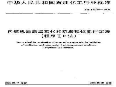 本标准规定了评定内燃机油的高温氧化变稠、高温油泥和溪膜等沉积物生成倾向寄抗磨损性能的方法。本标准适用于汽油机油(例如:SG、SH、GF-1、SJ/GF-2)和柴油机油高温氧化和抗磨损等性能评定。 SH/T 0758-2005 内燃机油高温氧化和抗磨损性能评定法(程序ⅢE法) SH/T0758-2005 标准下载解压密码:www.bzxz.net