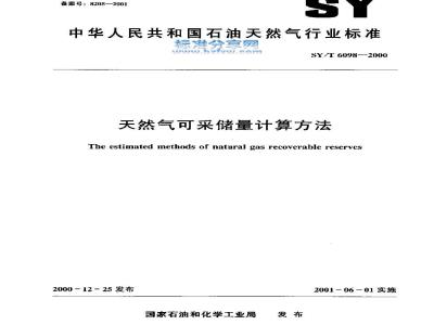3.增加了油藏溶解气类型划分的内容。4.对气藏废弃条件进行了修订。5.对可采储量计算方法迹行了修订。将SY/T6098-94和SY/T6220—1996中同类的方法(如物质平衡法、水驱特征曲线法、数值模拟法、类比法)进行了合并,并将这两个标准中不同的方法进行「筛选,删去了平均产率法利罗杰斯蒂函数法,并适当补充「近年来使用效果较好的新方法。本标准从实施之日起,同时代替SY/T6098—94和SY/I6220—1996,本标准的附录 A是标准的附录。本标准巾中国石池天然气集团公司提出:本标准由油气田开发专业标准化委员会归口。本标准起草单位:国石油西南油气出分公司勘探开发研究院。本标准起节人张伦友