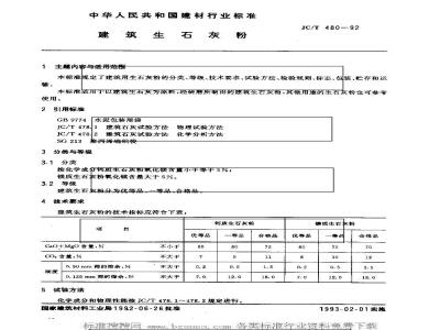 本标准适用于以建筑生石灰粉为原料,经研磨所制得的建筑生石灰粉,其它用途的生石灰粉也可参考使用。 JC/T 480-1992 建筑生石灰粉 JC/T480-1992 标准下载解压密码:www.bzxz.net