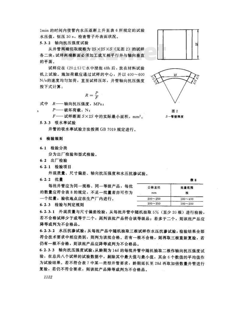 6.2.3.2水压抗渗试验:从每批产品中随机抽取三根试样作水压抗渗试验,检验结果全部符合技术要求中相应类别,则判为该批合格。若有一根不合格,则再取三根重新复验,若仍有一根不合格,则该批产品应降等或判为不合格品。6.2.3.3轴向抗压强度试验:从龄期为14d的每批井管中随机抽取二根作轴向抗压强度试验,在总共八个试样的试验数据中,剔除其中最大值与最小值,其余6个数值的平均值作为试验结果。若不符合表7中某一类型井管要求,龄期延长至28d再取加倍数量井管进行复验,若仍不符合要求,则该批产品降等或判为不合格品。1122