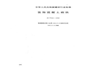 本标准规定了装饰混凝土砌块的产品分类、等级与标记、材料、技术要求、试验方法、检验规则及标志、堆放、运输等。本标准主要适用于建筑和市政等工程用的水泥混凝土装饰砌块(以下简称装饰砌块),如劈离、凿毛、条纹、磨光、坍陷、雕塑和露集料等预先经过饰面加工的装饰砌块。不适用于表面涂敷着色的装饰砌块。 JC/T 641-1996 装饰混凝土砌块 JC/T641-1996 标准下载解压密码:www.bzxz.net