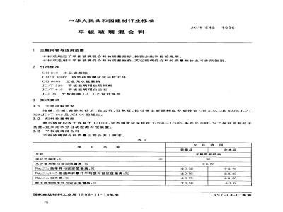 本标准规定了平板玻璃混合料的质量指标、检验方法和检验规则。JC/T 648—1996