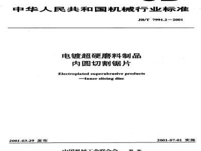 JB/T 7991.2-2001 本标准是对JB/T 7991.2-1995《电镀金刚石 内圆切割锯片》的修订。修订时增加了尺寸规格及磨料种类。 本标准规定了电镀超硬磨料制品——内圆切割锯片的形状,代号,尺寸,技术要求,试验方法和检验规则。 本标准适用于电镀金属结合剂超硬磨料内圆切割锯片。 本标准于1987年6月以GB 8066-87首次发布,于1996年4月标准号调整为JB/T 7991.2-95,本次是第一次修订。 JB/T 7991.2-2001 电镀超硬磨料制品 内圆切割锯片 JB/T7991.2-2001 标准下载解压密码:www.bzxz.net