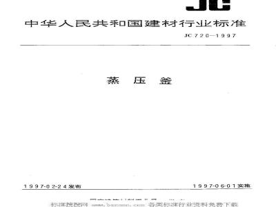 代替 JC 7 2 0 - 8 7(1 9 9 6)本标推规定了压釜的产品分类,技术要求,试验方法,检验规则及标志、包装、运输和贮存等。本标准适用于介质为饱和蒸汽或压缩空气,工作压力不大于2.5MPa,工作温度为0-~250℃的建材行业用钢制压签。