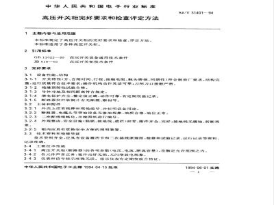 3.4.1高压开关柜(断路器)的各项参数(电压、电流、断流容量),在额定允许范围之内。3.4.2各元件声音正常,瓷件完好无损、无闪络放电现象。3.4.3仪表和信号指示准确无误。指示仪表有定期校验合格证。中华人民共和国电子工业部1994-04-15批准1994-06-01实施