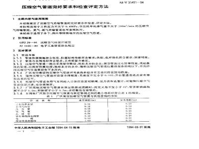 本标准规定了压缩空气传输管道的完好要求和检查、评定方法。本标准适用于工作压力不大于0.S MPa,空压机单机排气量不大于loom丫min的压缩空气传输管道、氮气、氢气传输管道也可参照执行。本标准不适用于井下、洞内等特殊场所的压缩空气管道。 SJ/T 31451-1994 压缩空气管道完好要求和检查评定方法 SJ/T31451-1994 标准下载解压密码:www.bzxz.net