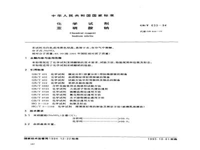 本标准规定了化学试剂亚硝酸钠的技术要求、试验方法、检验规则和包装及标志。本标准适用于化学试剂亚硝酸钠的检验。 GB/T 633-1994 化学试剂 亚硝酸钠 GB/T633-1994 标准下载解压密码:www.bzxz.net