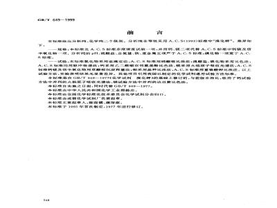 一一试验:本标准氯化物采用返滴定法,A.C.S标准用硝酸银比独法;溴酸盐、碘化物采用比色法,A.C.S标准均用脉冲极谱法;钙采用乙二醛缩双邻氨基酚比色法、镁采用火焰原子吸收光谱法,A.C.S标准钙镁及倍半氧化物用草酸铵沉淀称量法;钡采用晶种比浊法,A.C.S标准用重铬酸钾比浊法。以上试验方法,实验表明结果无显著差异。其他项目引用我国已制定的化学试剂通用试验方法标准。本标准是在GB/T649--1977《化学试剂漠化钾》的基础上修订的,与前版本相比,取消了钙试验方法中并列的火焰原子吸收光谱法、镁试验方法中并列的达旦黄比色法。本标准自实施之日起,同时代替GB/T649—1977。本标准由中华人民共和国化学工业部提出。本标准由全国化学标准化技术委员会化学试剂分会归口。本标准由成都化学试剂广负责起草。本标准主要起草人:陈俊儒、康厚淑。本标准于1965年首次制定,1977年进行修订。548