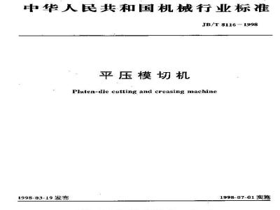 本标准是对JB/8116一95平压模切机的悠订,本标准与兼整汀的标难在以下重要技术内窄上有所改案:型式中增加自动立式平压换切机有关技术数:强幅面按照GB/15467-19%5<印刷技术单张纸印别机尺寸系列3制订:够订了模划划毁俯差的检溃计算方!降低半自动平压模切机的嗪声值:·增加牛自动平压模切机的有关机效空全装遭要求。本标准自实施之日起,同时代替JB/T8116一95本标准由全国印测机城抹准化技术委员会提出并归口。本标准负责起草单位:上海亚华印制机越有限公司。本标准梦加走单单业人势团公可景楼镇印刷包装划撼有限公山玉印(集团)公司准市印别机核总厂等.