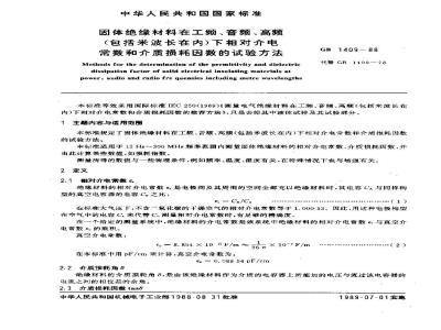 常数和介质损耗因数的试验方法Methods for the determination of the permittivity and dielectricdissipation factor of solid electrical Insulating materials atpower, audio and radio fre quensies including metre wavelengthsGB1409-88