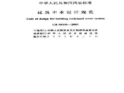 现世准建筑中水没计规范2为家准,编号为G503362002,自200年3月「「起实箍,其中,第0.5,1U,1,3,.6、3. 1. 7、5.4.1、. 4. 7、6. 2. 8、9.. 1、8. .3,8. -. 6条为强制性条文,必额产格决行。本热范出出设部标准定察研究听组!中国计划出版社出版送行。