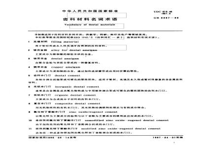 Vodabulary of dental materials本标准适用于齿科材料名词术语,供教学、科研、医疗及生产等领域使用。UDC 615.46