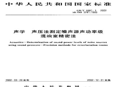 0.1本标准是GB/T[1367有关压达副定声源市功率级的票列标准之一,该系刻标雕规定「州正齿划定器,证各,及其附件的产功率的各种达,当选用(B1436?系列中的一种方法时,必须选种采动用网试条件和已的的一种,1S012001和GB14367中挑供了招助选氧的股导则。CB门1436/系列只是给了关干链测凯器或没备运行和安装的一般原列:对于特定类型的机器和设各,参考其弹声划试规范,对宽表和运行条件做出详细说明:0.2本标准总定了皮用具有规定声学特性的混响测试室来输定作为球率函缴的山源幅射声收率的实验享分法其本标准系列的其他件(见表1和GB3767或GB/T15-04)提出了不同的环境要求,长有那世独性的房回不活用于本标游。本标业中,月声压测量来计算声功中些于下违前提:声源在据响划试室中发剂一定的声功案,空间和则间半均的均方声正卢按正比于肃功率,此外只与房间的声学和几圳性质以及穿气的物理常敏有关