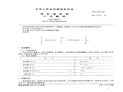 本标准适用于化学合成法制得的D-泛酸钙,在饲料工业中作为维生素类饲料添加剂。分子式:C.H,CaN,Ol。