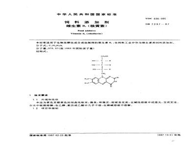 本标准适用于生物发酵法或合成法制得的维生素B,,在饲料工业中作为维生素类饲料添加剂。分子式:C,H.N,o。
