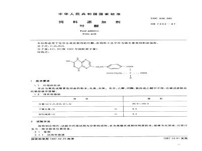 本标准适用于化学合成法制得的叶酸,在饲料工业中作为维生素类饲料添加剂。分子式:C,H,N,O。