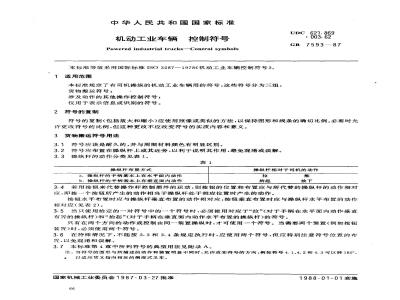 本标准规定了有司机操纵的机动工业车辆用的符号,这些符号分为三组:货物搬运符号;涉及动作的其他操作控制符号;仅用于表示信息或识别的符号。 GB/T 7593-1987 机动工业车辆 控制符号 GB/T7593-1987 标准下载解压密码:www.bzxz.net
