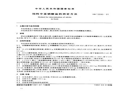 本标准规定了饲料中亚硝酸盐的测定方法。本标准适用于饲料原料(鱼粉)、配合饲料(包括混合饲料)中亚硝酸盐的测定。 GB 13085-1991 饲料中亚硝酸盐的测定方法 GB13085-1991 标准下载解压密码:www.bzxz.net