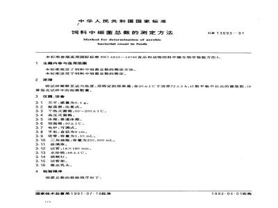本标准规定饲料中细菌总数的测定方法。本标准适用饲料中细菌总数的测定。 GB/T 13093-1991 饲料中细菌总数的测定方法 GB/T13093-1991 标准下载解压密码:www.bzxz.net