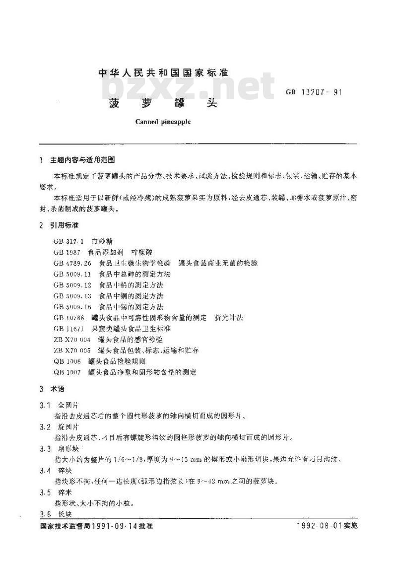 本标准适用于以新鲜(或经冷燕)的成熟菠萝果实为原料,经云皮通芯、装糖、糖水或菠萝原汁、密封、杀菌制成的波萝罐头。